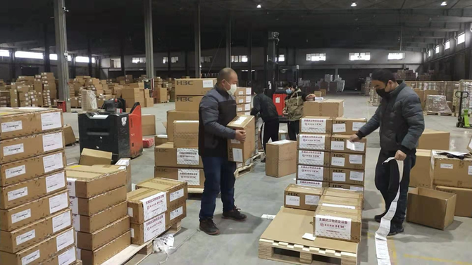 图片说明:捐赠火神山医院的设备在新华三仓库调集完货