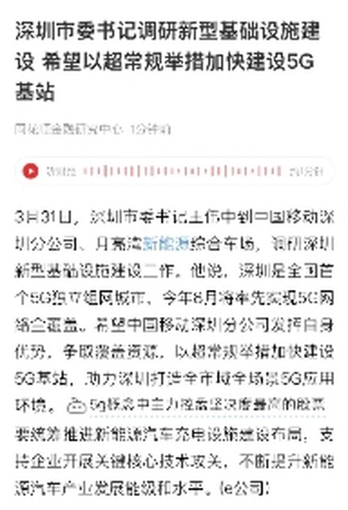 另一方面,2020年作为5G发展的重要一年,各国都在抢占5G发展新机遇。其中中国近期将新基建作为提振国家经济发展的新方向,而5G作为领衔技术意义重大,有了政策的加持,中国5G建设将迎来快速发展阶段。各地方政府也在以积极的力度推动5G的发展,例如,3月31日,深圳市委书记王伟中到中国移动深圳分公司调研,要求“以超常规举措加快5G基站建设,助力深圳打造全市域全场景5G应用环境”。