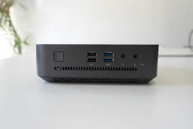 产品正面为接口设计,从左向右以此为电源键、两个USB3.0接口、两个USB2.0接口、一个耳机插口、一个麦克风插口以及一个CMS孔设计,最底部为散热孔设计。