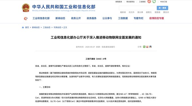 2020年5月,工信部办公厅正式发布了《关于深入推进移动物联网全面发展的通知》。其中,工信部部署了五项重点任务,包括网络建设、技术标准、行业应用、产业体系、安全保障方面的工作内容。