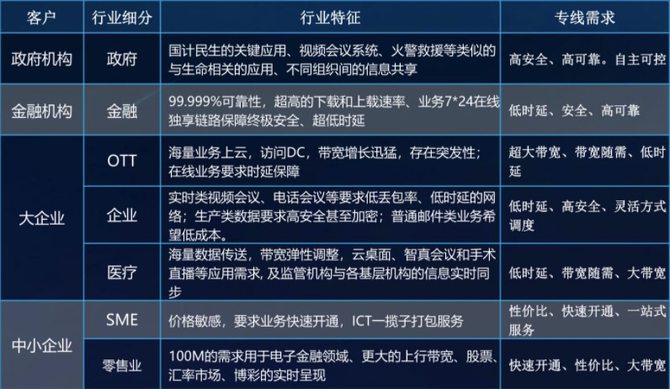 值得注意的是,专线部署具有强烈的行业属性,带宽、时延、安全等网络质量参数与行业需求密切相关,所以就出现了“一行业一网络”甚至“一场景一网络”的发展形式。