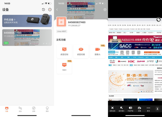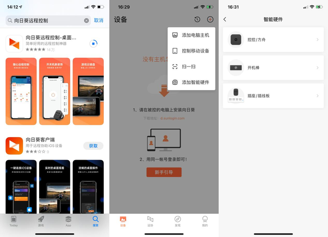 为了方便演示,我们此次在控制端使用手机(IOS系统),在受控端使用笔记本(Mac系统),在网络端使用Wi-Fi连接。通过应用市场下载安装“向日葵远程控制”,注册登录后点击右上角“+”,添加智能硬件,选择“控控/方舟”。