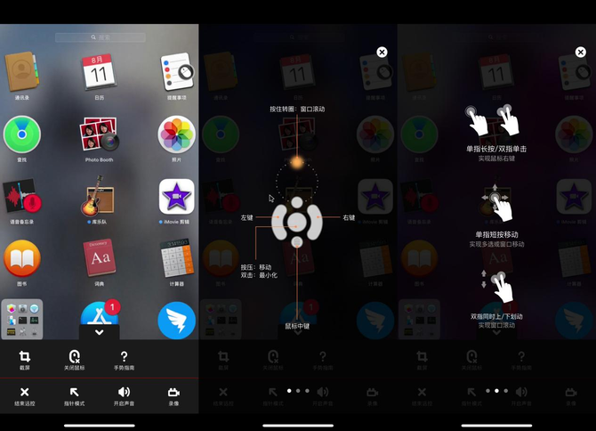 以办公场景为例,上图是手机实时控制电脑的切图,我们使用最频繁的便是桌面控制功能,这里可以截屏、录像、开关声音、结束远控,还可以开关虚拟鼠标。其中手势指南里,详细地记录了模拟鼠标的使用方法。