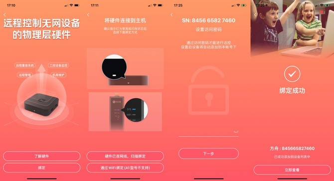 然后,选择“绑定”,通过Wi-Fi绑定(A1型号不支持)。当手机连接硬件的Wi-Fi热点后,显示正在连接硬件。连接成功后设置访问密码,即绑定成功。