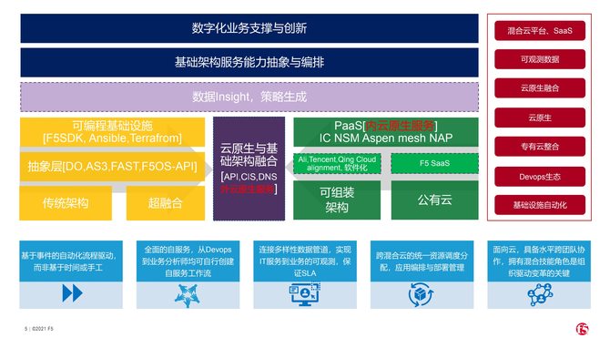 在传统基础设施里,F5负责了从数据中心入口的边界,到数据中心服务的认证,再到后台应用的负载均衡,最后到应用服务的发布,以及应用服务的策略管控,旨在帮助应用更好的、更安全的、更优化的交付,支撑企业数字化的创新和业务的敏捷性。