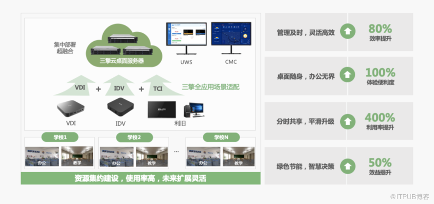 锐捷“教育局三擎云桌面解决方案”通过三擎融合技术,将VDI、IDV、TCI三种技术架构统一在一个平台管理,满足不同场景的接入需求,并通过在教育局或运营商中心机房集中式部署云服务器,实现教育局云桌面统一纳管的“一朵云”。这样的“一朵云”能带来四大优势:管理及时、灵活高效的“一朵云”;桌面随身、办公无界的“一朵云”;分时共享、平滑升级的“一朵云”;绿色节能、智慧决策的“一朵云”。