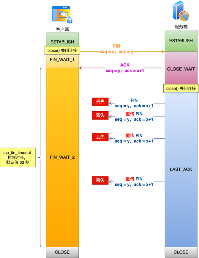 举个例子,假设 tcp_orphan_retries 为 2,当第四次挥手一直丢失时,发生的过程如下: