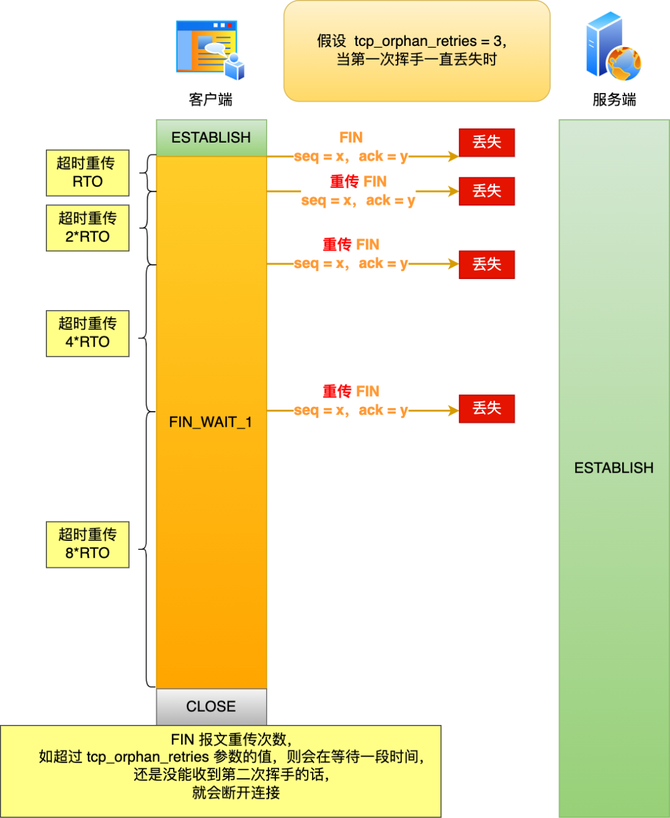 举个例子,假设 tcp_orphan_retries 参数值为 3,当第一次挥手一直丢失时,发生的过程如下图: