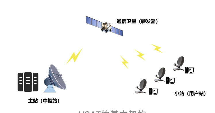 一套完整的VSAT系统,由通信卫星上的转发器、地面大口径主站(中枢站)以及众多小口径的小站共同构成。