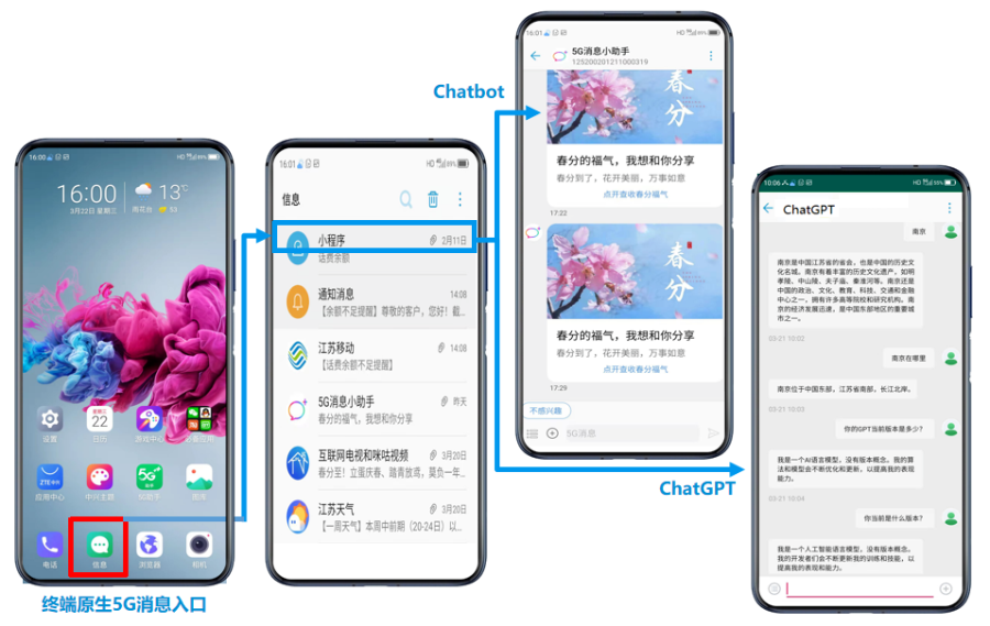 如上图,基于移动终端5G消息业务原生入口,用户可一键进入小程序(Chatbot),小程序是Chatbot应用发布的商店和直达入口。传统Chatbot和支持ChatGPT的Chatbot都可以基于运营商网络和管理平台完成上线、发布,用户通过入口在线搜索或二维码链接获达访问,开启机器人对话聊天。