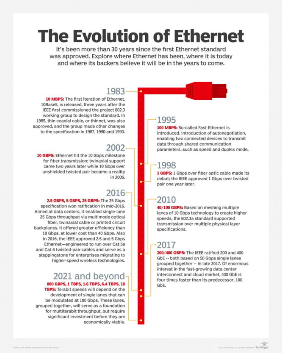 如今,以太网仍然是全球有线网络通信的主要标准。它的处理数据速率,从2.94Mbps、10Mbps,一路升级到了现在的400Gbps、800Gbps,甚至1.6Tbps。
