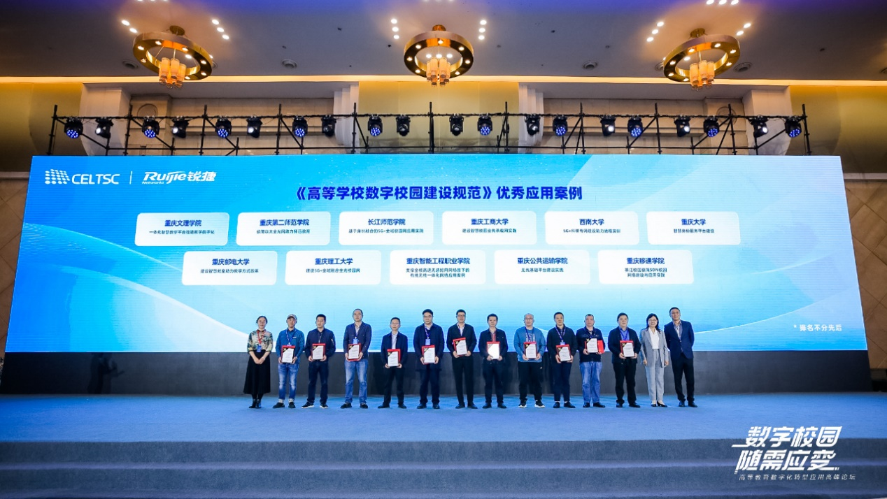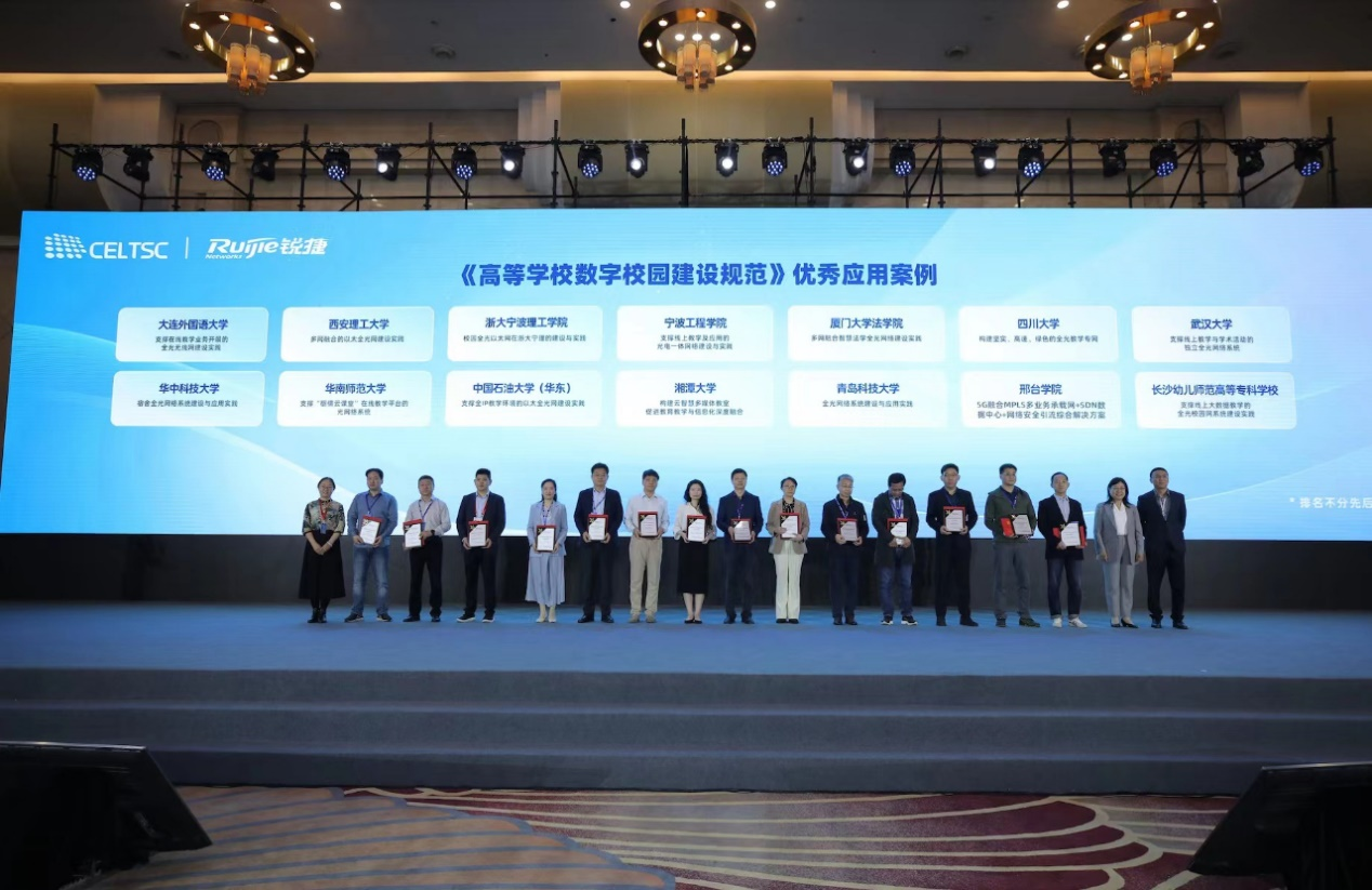 在《高等学校数字校园建设规范(试行)》(下文简称“规范”)的引领下,各院校结合各自发展实际,进行了创新性探索。全国信息技术标准化技术委员会教育技术分技术委员会暨教育部教育信息化技术标准委员会秘书长郑莉、副主任委员杜婧及锐捷网络高职教行业部总经理黄镇为践行中体验良好、特色鲜明的41所高校颁发了优秀应用案例奖。
