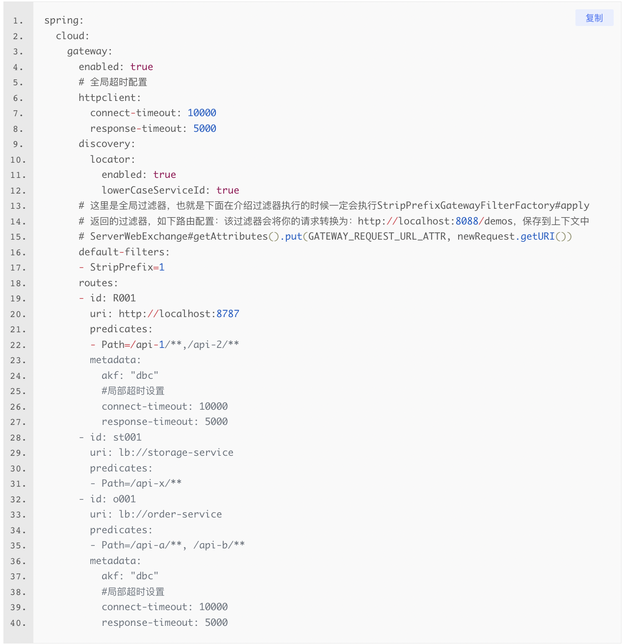 获取路由Route route = exchange.getAttribute(GATEWAY_ROUTE_ATTR);获取当前的Route信息。主要就用来获取配置路由时提供的配置信息,比如:超时时间设置,如上配置。RoutePredicateHandlerMapping#getHandlerInternal方法中保存路由到上下文中