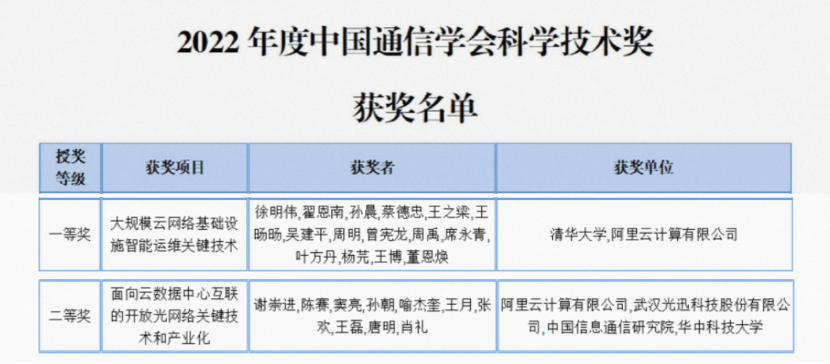 5月12日消息,中国通信学会日前正式公布了2022年度中国通信学会科学技术奖名单,阿里云与清华大学、华中科技大学等单位联合发起的“大规模云网络基础设施智能运维关键技术”和“面向云数据中心互联的开放光网络关键技术和产业化”两项目从179项参选项目中脱颖而出,分获中国通信学会技术发明奖一等奖和科技进步二等奖。