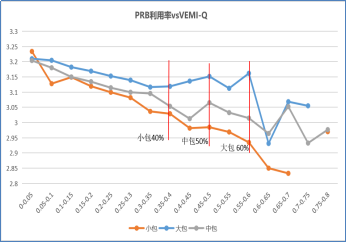 随着PRB增加,大中小包小区的VEMI-Q都有下降趋势;以视频业务感知满意度VEMI-Q=3.0作为基线,PRB利用率需要满足小包为40%、中包为50%、大包为60%的要求。