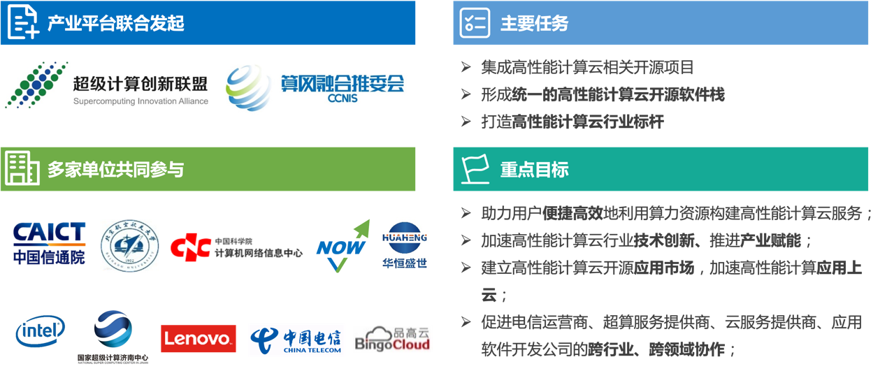 “高性能计算云开源计划”依托超级计算创新联盟与算网融合产业及标准推进委员会,由中国信通院、北京航空航天大学、中科院计算机网络信息中心、即算科技、北京华恒盛世科技有限公司、英特尔、国家超级计算济南中心、联想集团、中国电信和品高云10家单位共同发起,旨在构建业界首个高性能计算云开源参考架构,树立高性能计算云行业标杆。此次会议上,超级计算创新联盟秘书长金钟启动并介绍了“高性能计算云开源计划”的相关内容。高性能计算云开源版本预计2023年内正式发布。