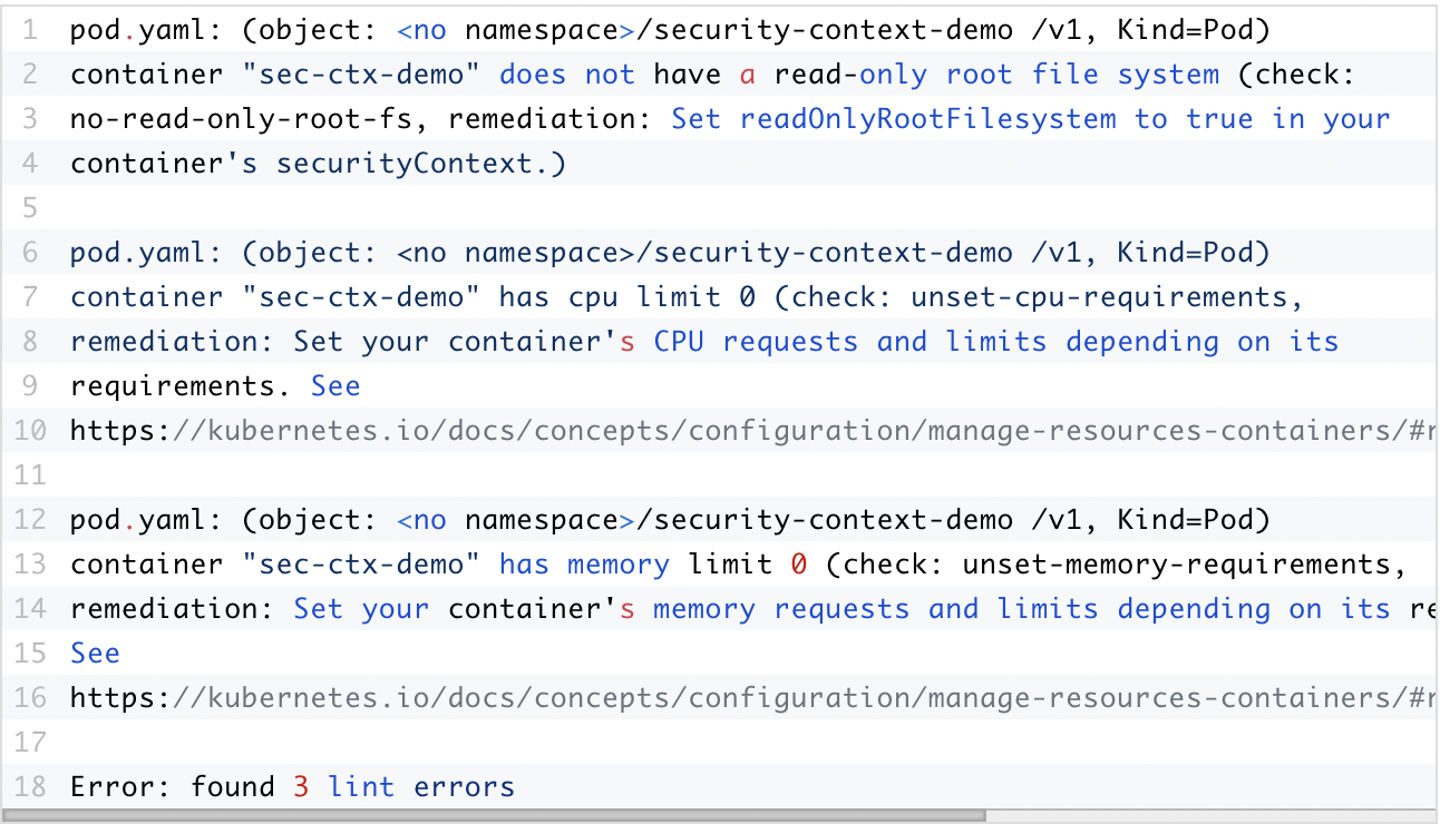 KubeLinter的输出将显示任何检测到的问题,以及建议的修复步骤。它还将提供发现lint错误的摘要。