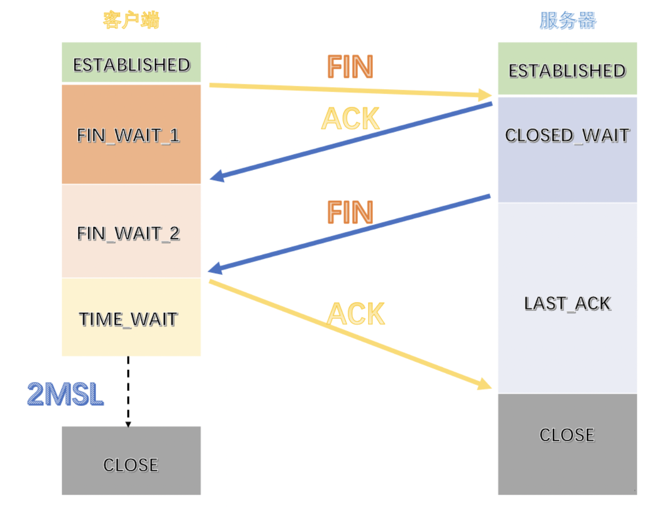 5、客户端收到服务器的FIN后,马上发送ACK给服务器,此时客户端进入TIME_WAIT状态,再过了2MSL长的时间后进入CLOSED状态(MSL指的是报文最大生存时间)。