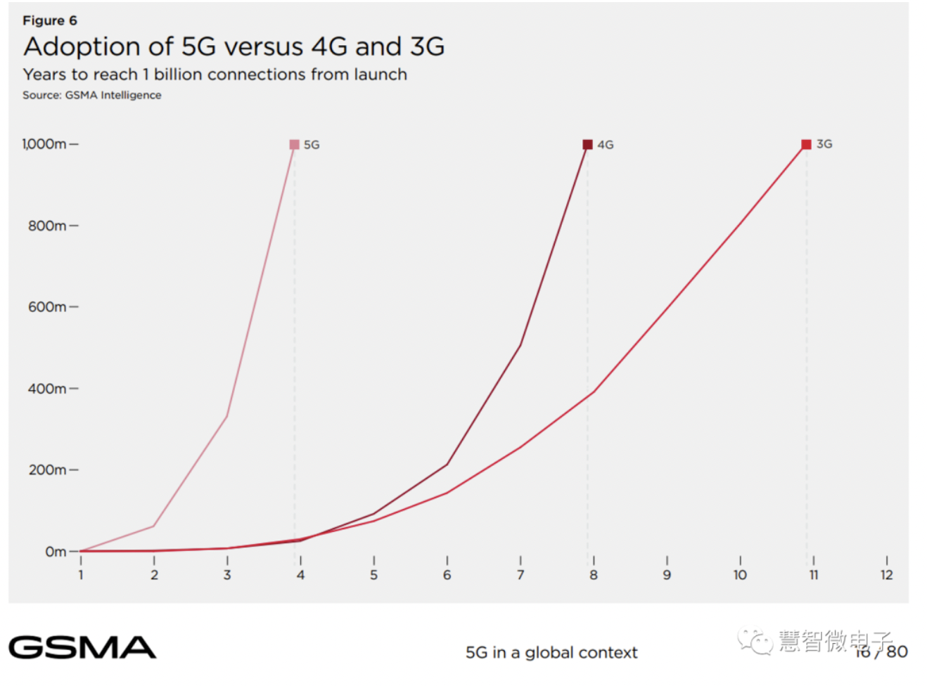 自2019年5G开始部署以来,5G在全球迎来快速发展。根据GSMA(全球移动通信系统协会)的统计,从部署元年开始计算,3G经过了11年达到了10亿用户,4G用了8年,而5G只用了4年时间。到2023年,全球5G用户已达15亿。