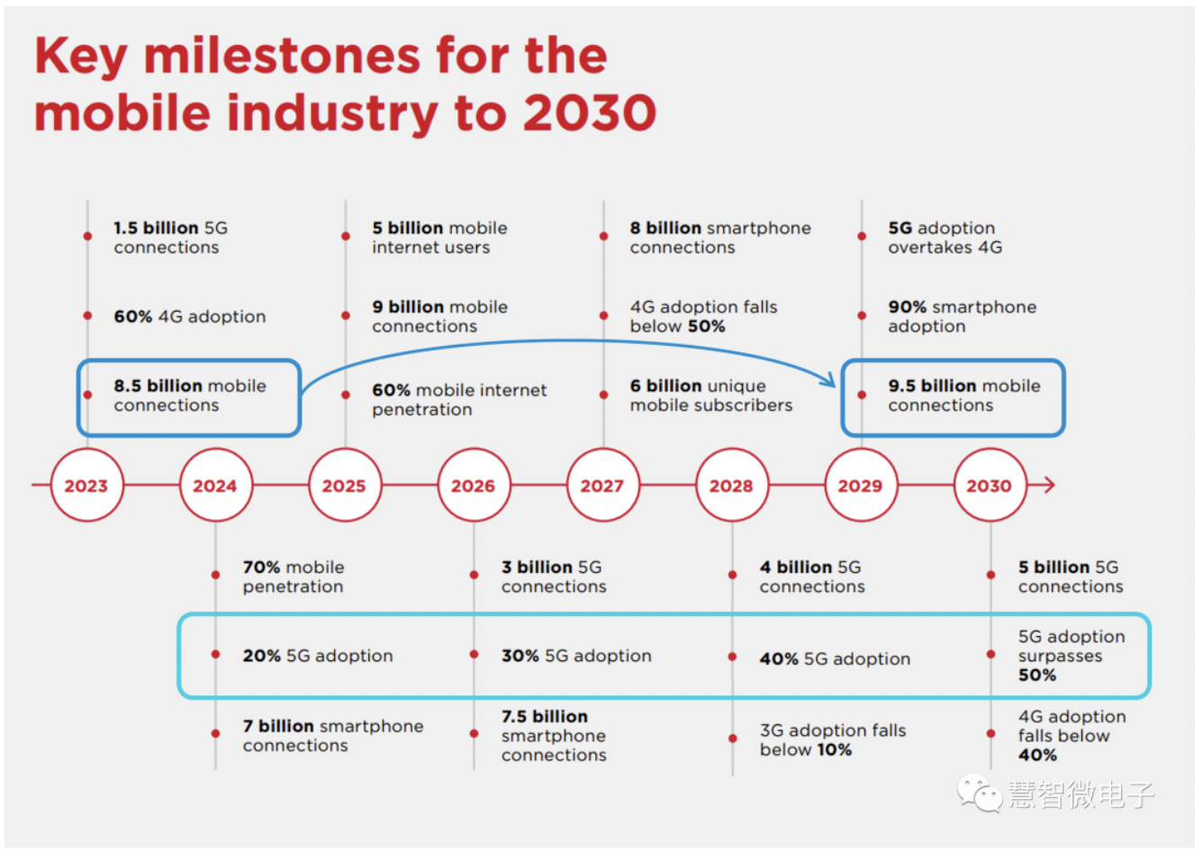 根据GSMA对未来7年的预测,在接下来的7年时间里,全球蜂窝移动终端连接数目将由85亿继续增长至95亿。其中5G连接数目增长迅速,将从2023年的15亿连接数,增长至2030年的50亿。占总连接数的比例从20%,增长至超过50%。