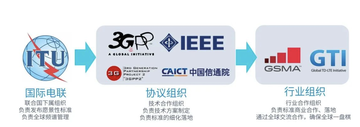 第一个步骤是国际电联等全球无线电管理机构发出愿景性标准,定义新协议的主要实现目标及主要时间点;第二个步骤是协议组织(如3GPP、IEEE等)制定技术方案,将协议进行标准化;第三个步骤是行业组织推动商业落地。