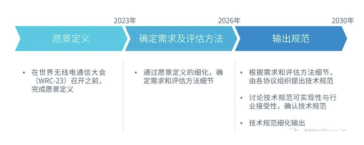 第一阶段是愿景定义阶段,这个阶段在2023年6月之前完成,将完成愿景定义,新应用趋势与技术趋势的识别,新场景、新频谱的定义。