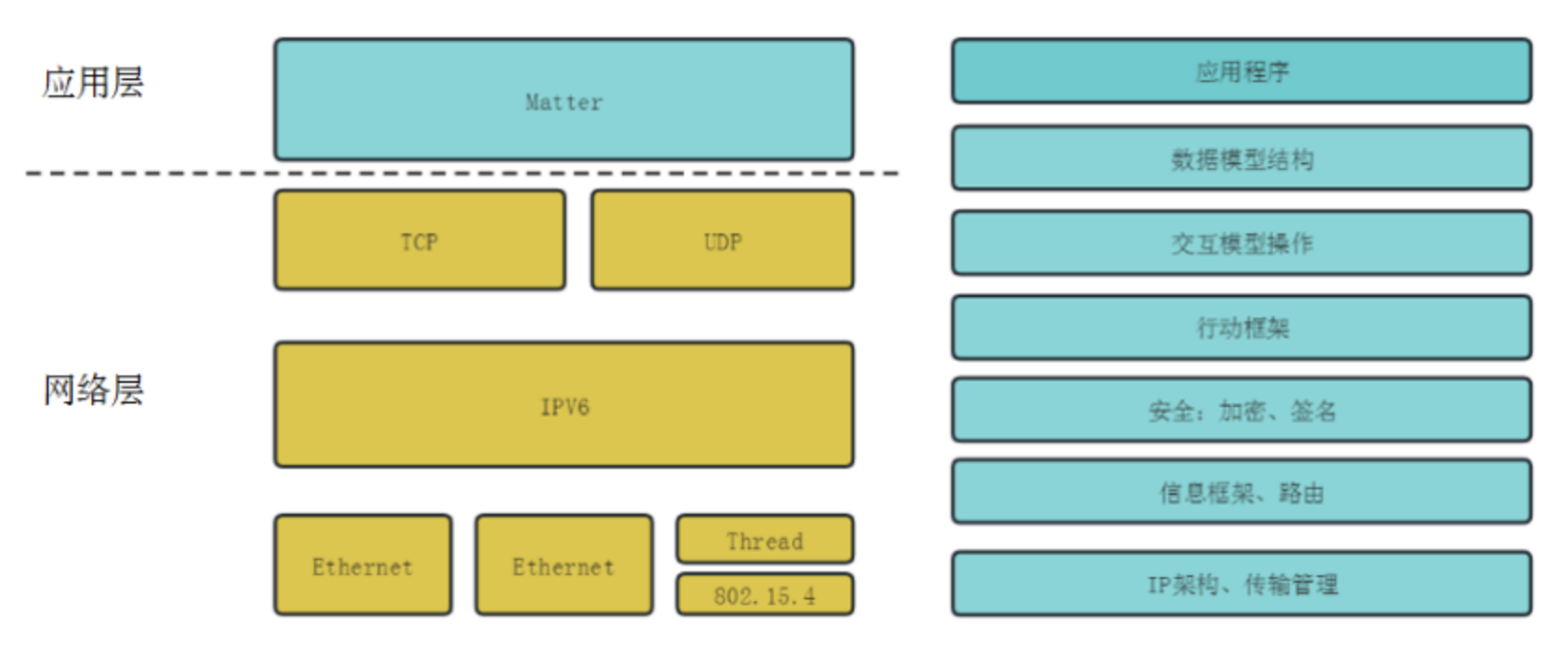 Matter旨在为智能家居设备建立一个通用的基于ipv6的通信协议,聚焦在制定应用层标准的协议规范(下图1左)。将应用层架构展开来看(下图1右),matter技术规范定义数据消息的封装和发送、通信的加密和授权、以及“物模型”和应用层数据的“交互模型”等。matter不关注产品物理层选用何种标准,只关注应用层是否遵守定义的规范。