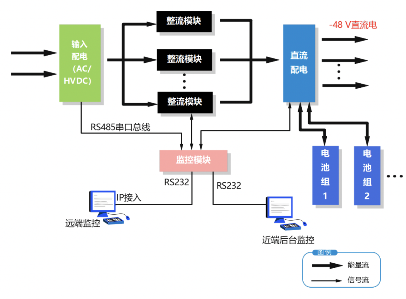 从上图可看出,-48 V电源就是通过整流模块将交流电或高压直流电转换而来。