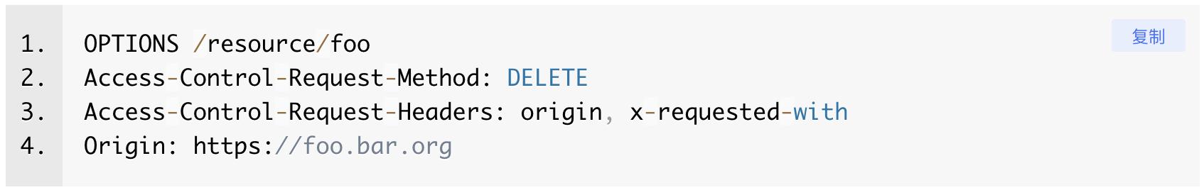 举个例子,一个客户端可能会在实际发送一个 DELETE 请求之前,先向服务器发起一个预检请求,用于询问是否可以向服务器发起一个 DELETE 请求: