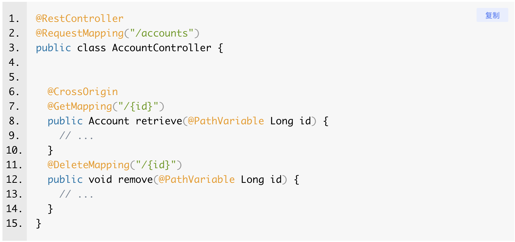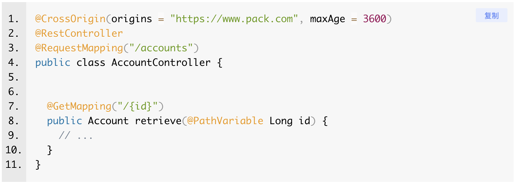 @CrossOrigin注释允许对带注释的控制器方法进行跨域请求,如下例所示: