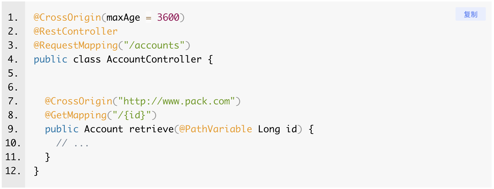 @CrossOrigin在类级别也受支持,并由所有方法继承,如下例所示: