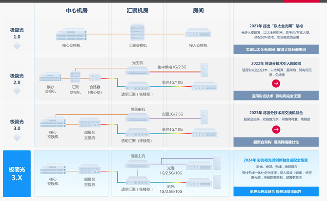 紧接着,锐捷网络在2024年再次升级极简光方案至3.X版本。该方案同时支持光改、光混、彩光三种架构,具备网络易扩展、长距离部署、真万兆入室等优势,前瞻性引入结合CWDM(粗波分复用)和以太全光的以太彩光技术,将多个不同波长的光信号复用在同一根光纤中传输,从而有效节省了光缆资源。