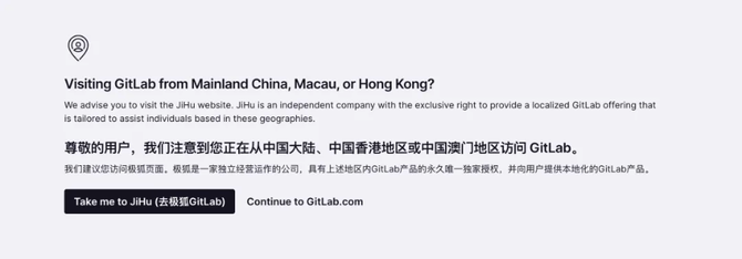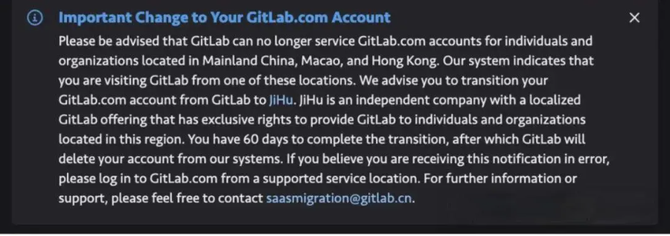 请注意,GitLab 无法为位于中国大陆、澳门和香港的个人和组织提供 GitLab.com 帐户服务。我们的系统显示您正在从这些位置之一访问 GitLab。我们建议您将 GitLab.com 帐户从 GitLab 转移到 jiHu。JiHu 是一家拥有本地化 GitLab 产品的独立公司,拥有向该地区的个人和组织提供 GitLab 的独家权利。您有 60 天的时间完成转换,之后 GitLab 将从我们的系统中删除您的帐户。如果您认为收到此通知有误,请从支持的服务位置登录 GitLab.com。如需更多信息或支持,请随时联系 saasmigration@gitlab.cn。