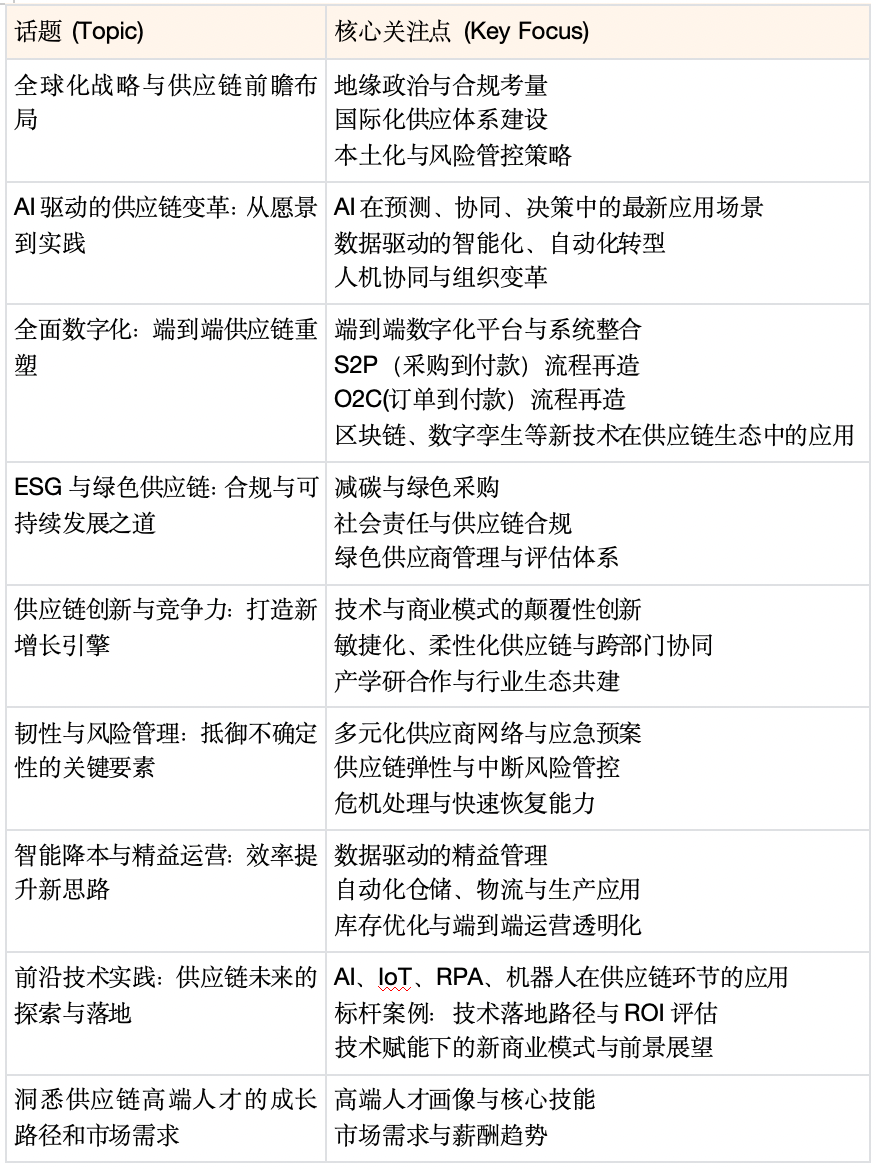 通过前期收集的200+份行业问卷,我们整理出与会同仁普遍关注的核心议题,涵盖技术创新、采购、行业、供应链战略等关键领域。期待与您共同开启这场聚焦行业痛点的深度对话,以多元视角共探产业未来。