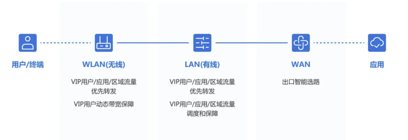 ▪ VIP业务专属优先级调度。智能识别VIP用户、VIP应用、普通用户和普通应用,在队列优先级上提前,提升VIP用户、VIP应用(可以是VIP用户的VIP应用,也可以是普通用户的VIP应用)等用网体验,关键应用如腾讯会议、飞书等体验零中断。