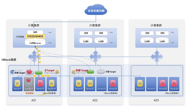 HBlock通过存储协议栈优化升级与分布式算法创新,在存储层实现跨可用区强一致性保障,构建跨可用区RPO=0、RTO秒级的异地多活、高性能块存储服务。系统在任意单可用区故障时,仍可达到99.9%以上的服务可用性(SLA)。通过负载均衡与多活架构,业务流量可快速切换至健康可用区,使终端用户对单可用区故障无感知。