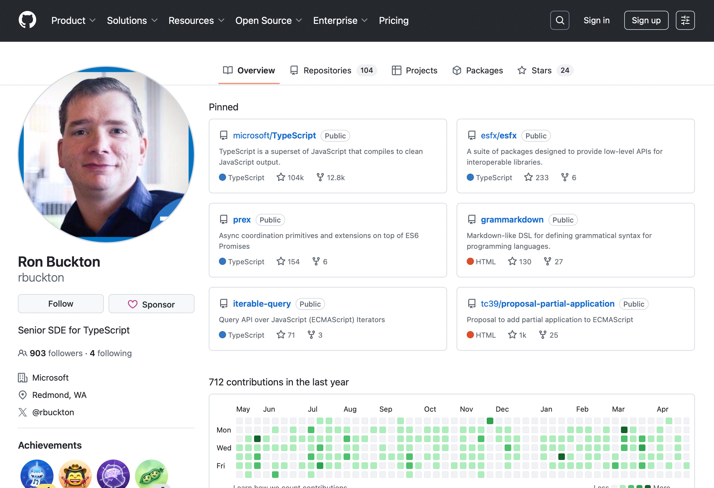 从microsoft/TypeScript仓库的统计来看,他是排名第6的代码贡献者:(https://github.com/microsoft/TypeScript/graphs/contributors),Ron Buckton今天在社交平台X上发帖称,“在微软工作了18年,其中大约10年时间我都在从事TypeScript 的相关工作,很遗憾在最新一轮裁员中,我被裁掉了。在开始寻找新工作之前,我需要几天时间来整理思绪。感谢所有在这段旅程中与我同行的人。”