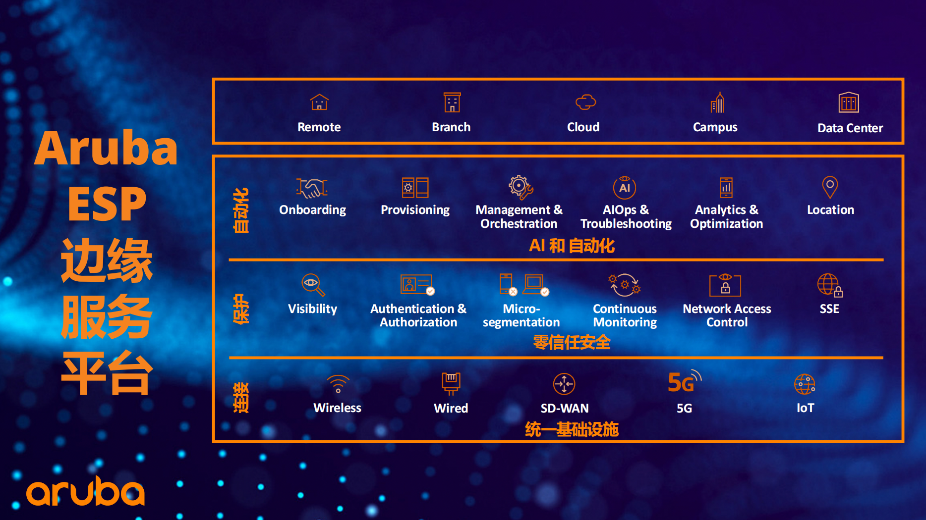 事实上,Aruba ESP(边缘服务平台)与“Networking for AI”的理念一脉相承,存在逻辑关联。Aruba ESP涵盖无线、有线、SD-WAN及5G产品和服务,叠加零信任安全和AI自动化等功能,旨在支持从远程办公到数据中心的所有场景。