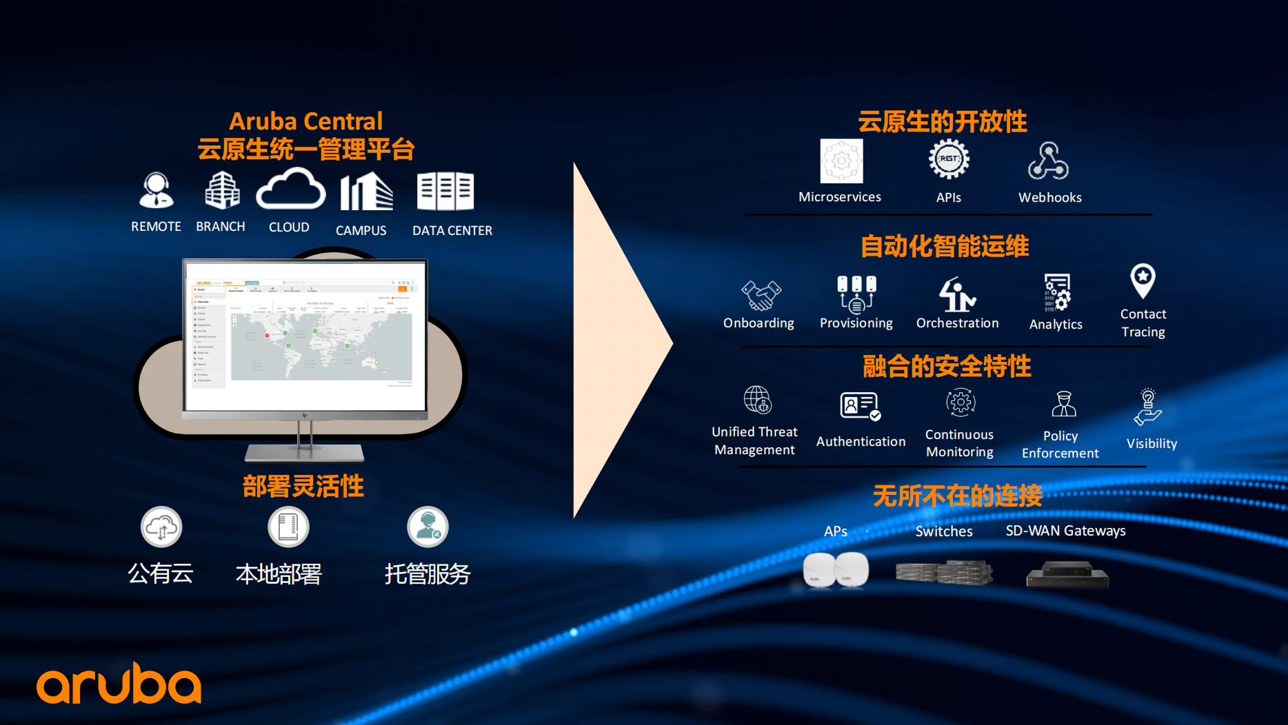 HPE Aruba Networking Central支持本地公有云模式和本地部署,并提供VPC托管服务。它能够对Aruba所有产品(包括无线、有线、SD-WAN等)进行统一管理,简化了网络运维的复杂性。作为云平台,HPE Aruba Networking Central融合了多种安全特性,包括威胁管理、身份验证、持续流量监控和策略下发等,全面提升了网络的安全性。