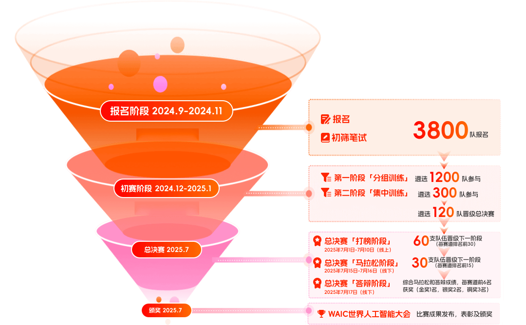 自去年9月赛事启动以来,大赛受到了来自全国高校学子与科研团队的广泛关注,赛事影响力不断扩大,吸引了超3800支团队参赛。经过激烈的初赛角逐,近百支队伍凭借卓越的技术创新能力脱颖而出,晋级总决赛。值得一提的是硕士、博士生团队占比超过半数,众多头部高校赛队纷纷晋级。此外,为进一步激发高校创新氛围,拓展优秀青年人才的参与广度,大赛组委会特设外卡邀约机制,邀请部分具备广泛影响力、学术氛围浓厚的高校参与总决赛。目前大赛已进入总决赛准备阶段。