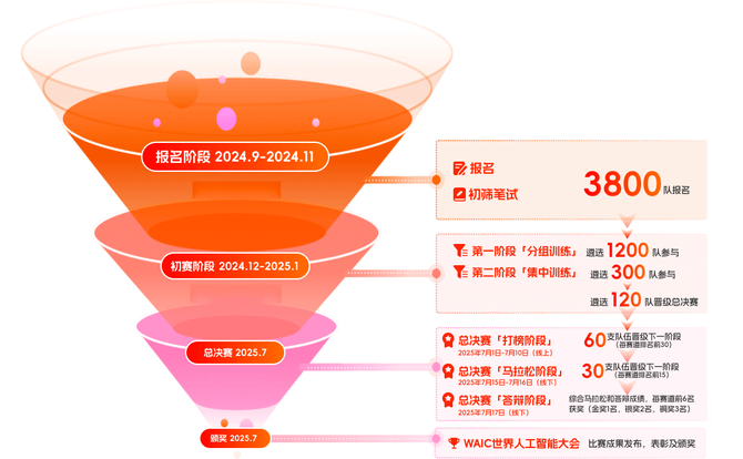 为全面考察选手的技术深度、实战能力与创新潜力,“天翼云息壤杯”高校AI大赛总决赛采用独特的“打榜+马拉松+答辩”三段式赛制。7月1日到10日总决赛打榜阶段(线上),各赛道排名前30强队伍晋级。7月15日到16日为总决赛马拉松阶段(线下),各赛道排名前15强队伍晋级。7月17日总决赛答辩阶段(线下),两个赛道分别进行现场答辩。总决赛线下阶段最终成绩为马拉松阶段成绩占比60%,现场答辩成绩占比40%。大赛组委会将根据最终得分进行排名,在WAIC世界人工智能大会上进行比赛成果发布,为各赛道获奖队伍颁发金、银、铜奖证书及奖金。此外,大赛还特别设立最富创意奖、最具人气奖、最 佳导师奖等特色奖项,构建全方位的激励体系,打造兼具专业性与参与感的赛事生态。