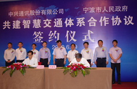 中兴通讯股份有限公司与宁波市政府签署共同建设智慧交通体系合作协议,双方将共同致力于把宁波建设成国内领先的智慧交通示范城市和智慧交通产业基地,联合打造智慧交通示范工程,建立一个智慧交通云平台,全面覆盖公路、水路、铁路、民航以及城市内部交通。智慧交通云平台涵盖交通综合感知与传输、交通整体调控、交通运行指挥与应急处置、交通运输物流服务信息、公众出行信息和交通管理与仿真决策支持等系统工程。