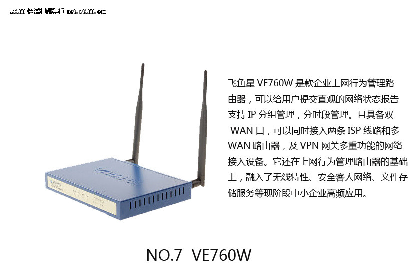 飞鱼星VE760W协助企业建立上网行为管理制度,并通过简单易用的功能切实执行制度;充分契合中小企业快速灵活的发展特点。目前市场价在800元左右,较低的成本可为企业带来实用的高效率。
