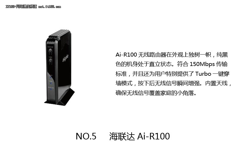Ai-R100无线路由器在外观上独树一帜,纯黑色的机身处于直立状态。符合150Mbps传输标准,并且还为用户特别提供了Turbo一键穿墙模式,按下后无线信号瞬间增强。内置天线,确保无线信号覆盖家庭的小角落。