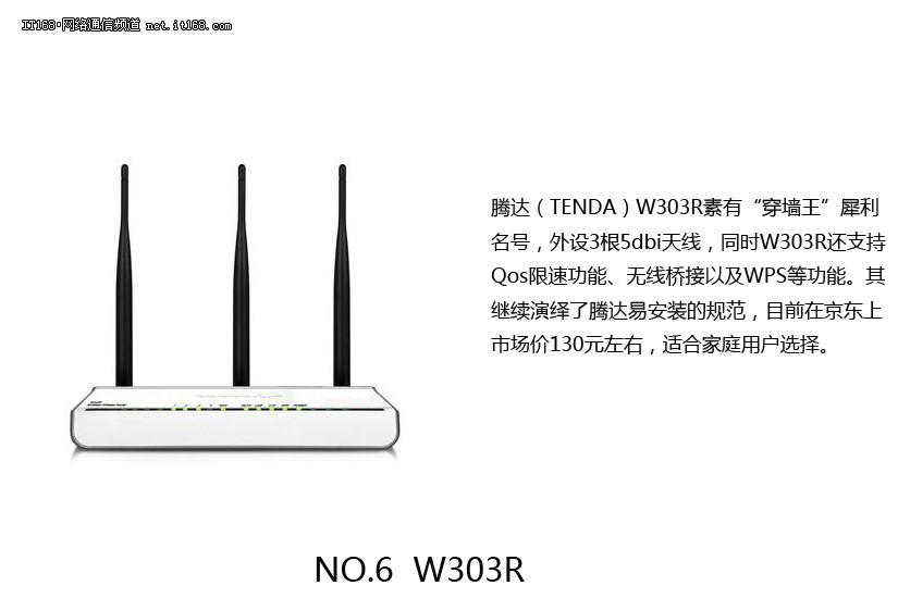腾达(TENDA)W303R路由器支持广泛的传输标准,传输速率高达300Mbps,尤其是其无线信号的覆盖率以及穿透能力,外设3根5dbi高增益天线,通过对芯片的深度开发和完美的兼容性测试,实现了无线信号更远范围的覆盖,最大覆盖范围高达2000平方,并能穿透三堵墙。是咖啡厅、餐厅、中小型企业办公不错的选择。